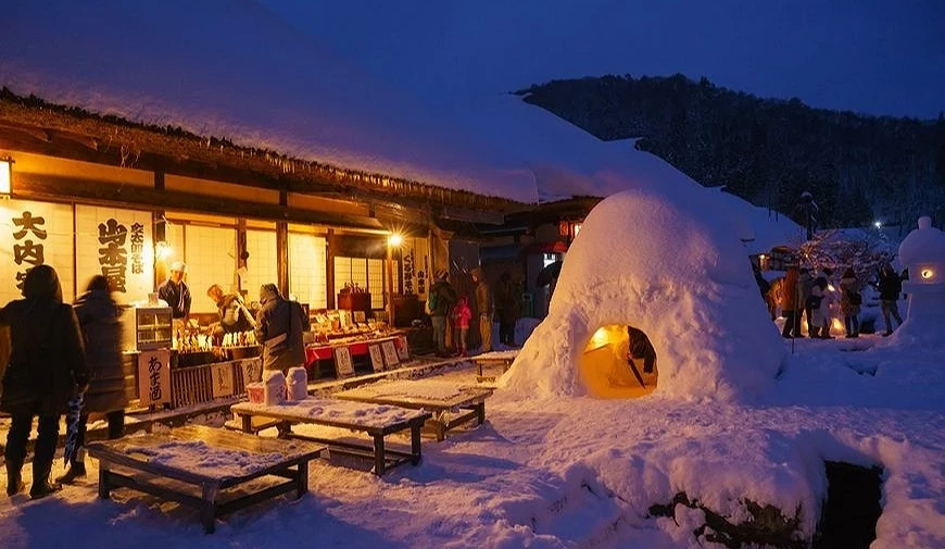 「大內宿雪祭」是大內宿冬季最具代表性的年度活動,於每年2月的第二個週末舉行。活動期間,居民會沿著宿場町街道親手堆製雪燈籠,並由身著兜襠布的男性手持御神火逐一點燈,在夜色中點亮整條街道。茅草屋在暖黃色燭光映照下,展現出與白天截然不同的風貌,其景致之美,令人久久難以忘懷。除此之外,現場還安排煙火施放、和太鼓演奏、蕎麥麵大胃王競賽與各式市集攤位,氣氛熱鬧萬分,吸引許多旅客專程前來朝聖。
