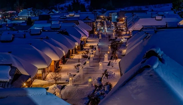 雪祭期間最吸睛的畫面,莫過於雪燈籠沿著街道兩側排列、整排茅草屋被柔和燈光照亮的夜景,無論是街道縱深構圖或低角度拍攝雪燈籠,都相當上鏡。晚間施放煙火時,可以提前到較高視角的位置卡位,同時捕捉花火與宿場町夜景交織的畫面喔!