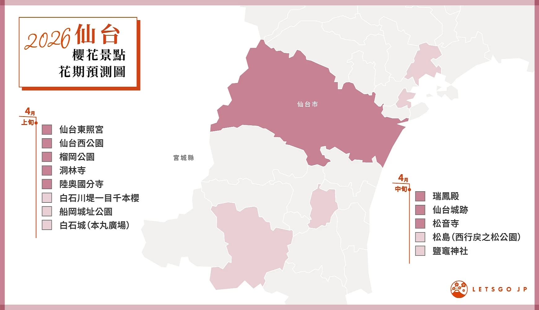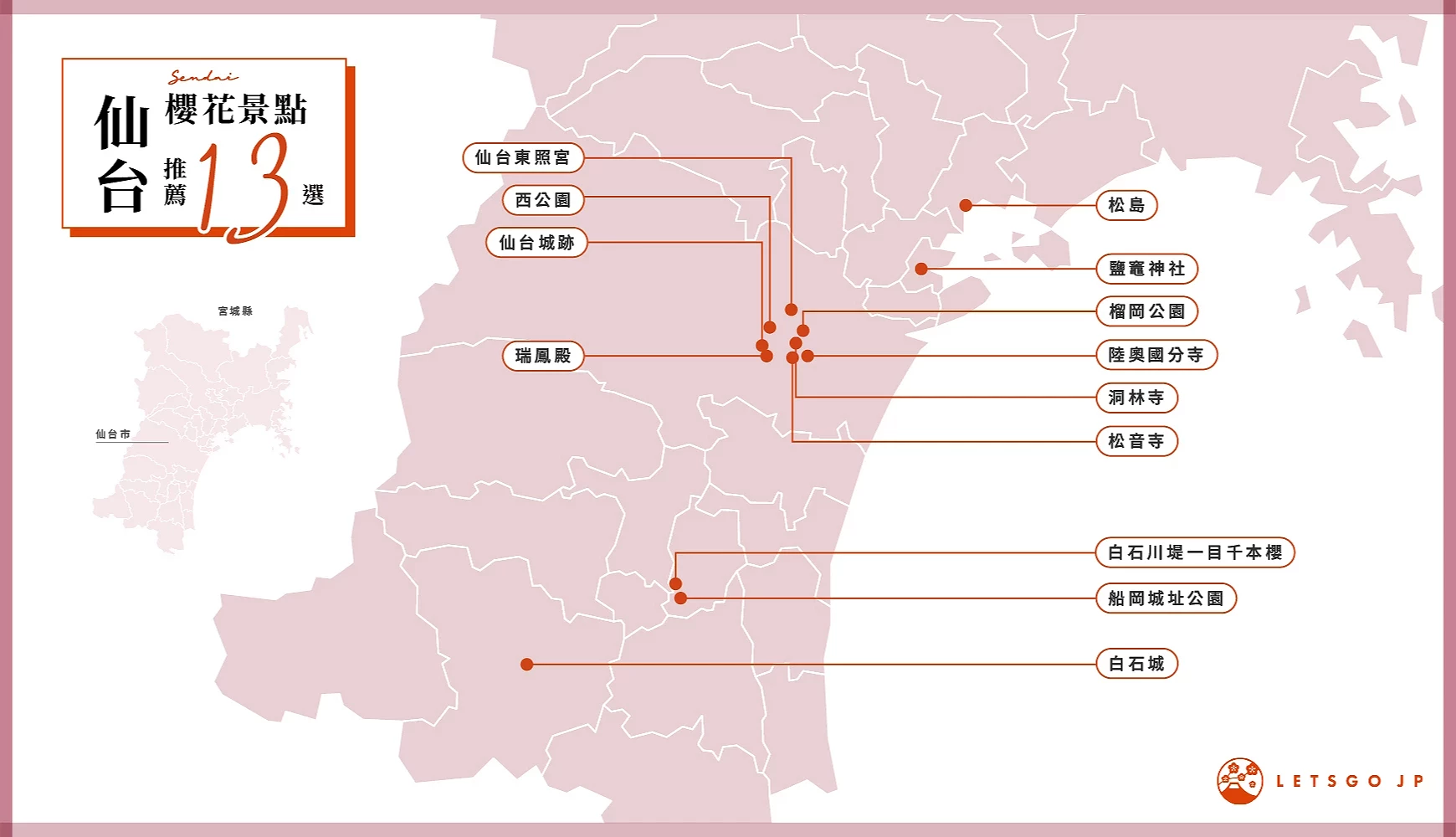 仙台櫻花春季經典必訪!本文精選仙台西公園、東照宮、榴岡公園、白石川堤一目千本櫻、船岡城址公園等人氣賞櫻名所,整理最佳觀賞期、景點特色與一日遊行程重點,快速掌握仙台、宮城櫻花季實用攻略。