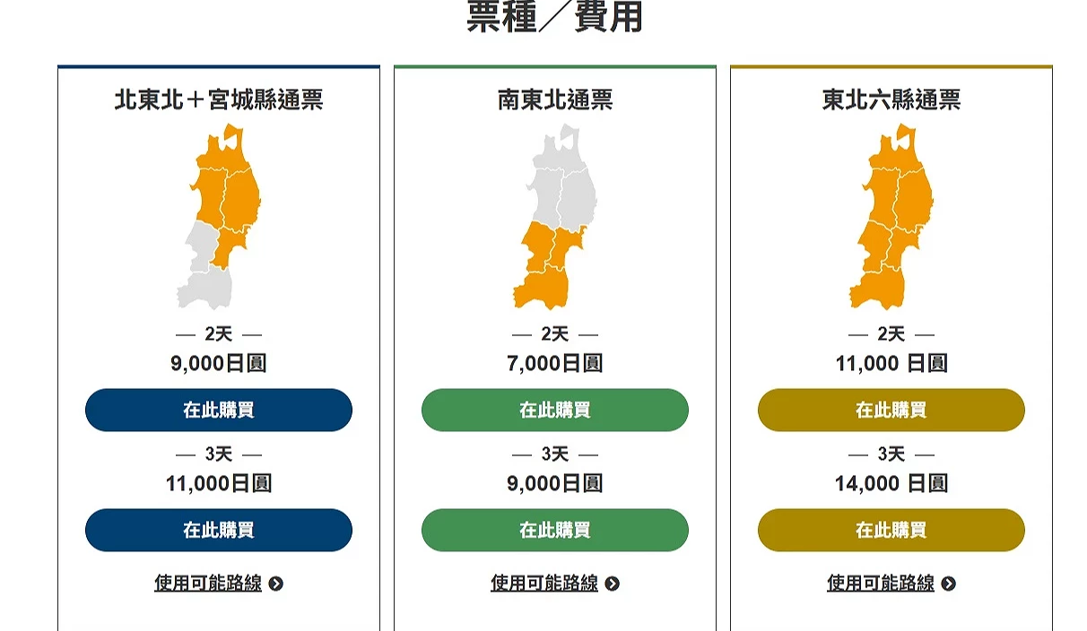 | 北東北+宮城縣通票 | 3天 | 11,000日圓 |