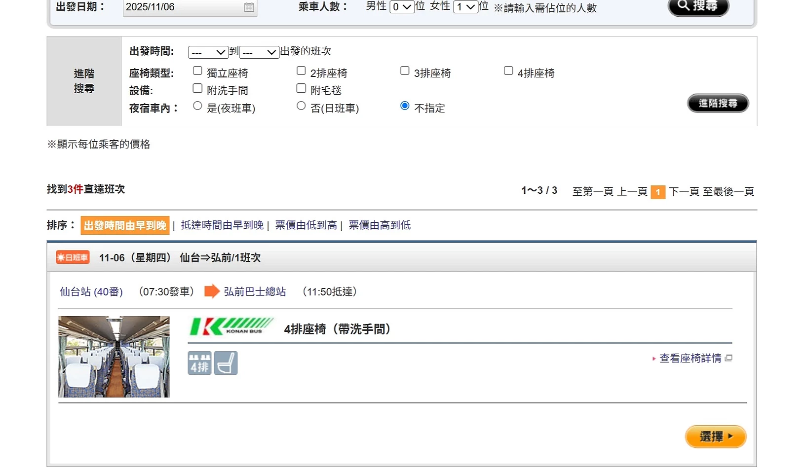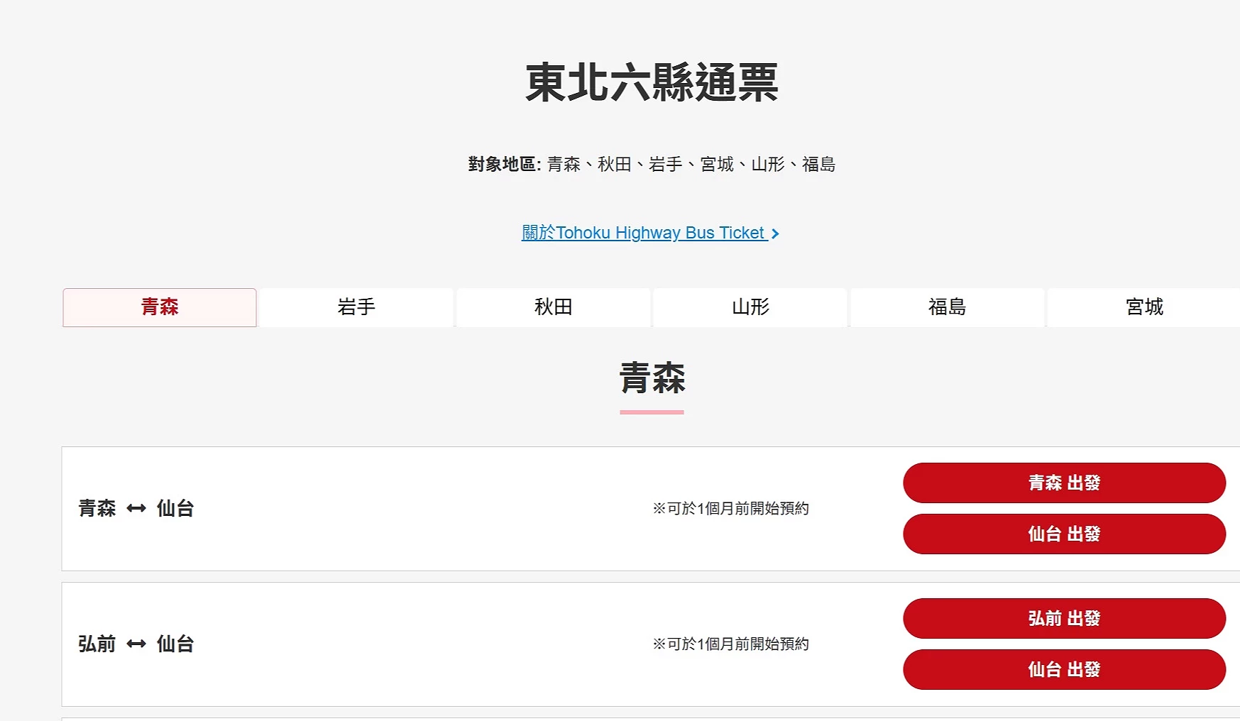 在路線搜尋頁面中,選擇中間的「Tohoku Highway Bus Ticket」,系統會自動套用通票資格,並列出可搭乘的高速巴士路線,確保查詢結果符合通票使用範圍。