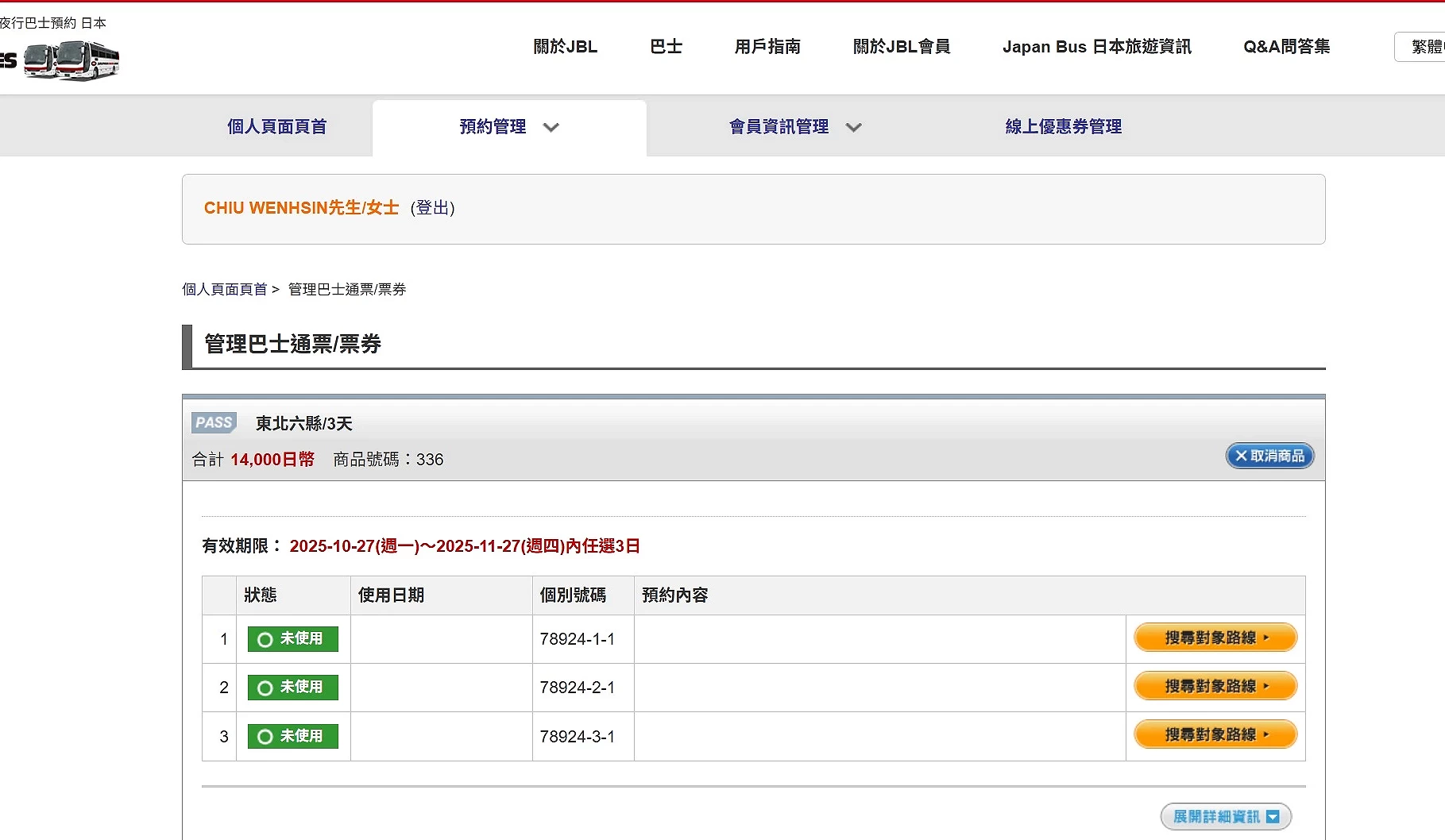 通票的使用天數自購買日起一個月內,可選擇任意 2 天或 3 天使用,並非固定連續日期,因此行程安排具有高度彈性。進入「預約管理」頁面後,點選「管理巴士通票・票券」,再選擇「搜尋對象路線」以查詢可搭乘的路線,方便行程規劃。