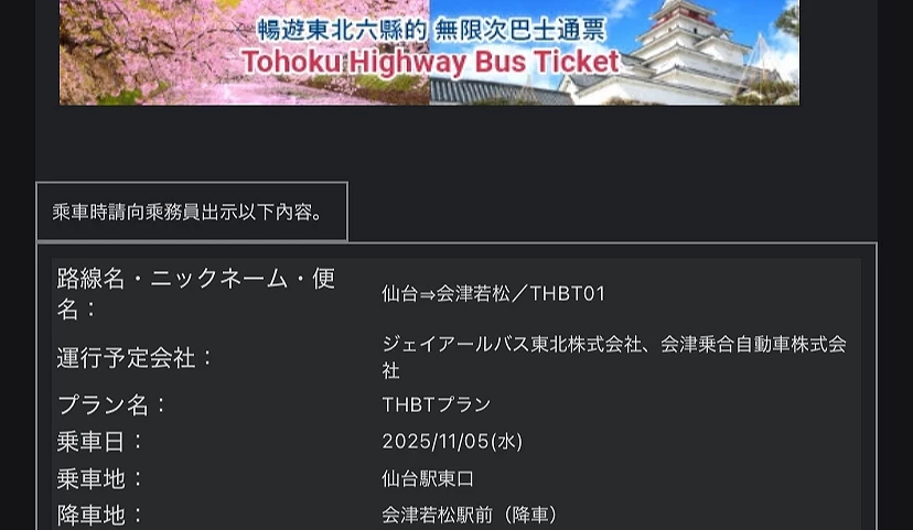「Tohoku Highway Bus Ticket」的使用方式